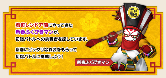 港町レンドア南にやってきた新春ふくびきマンが初詣バトルへの挑戦者を探しています。新春にぴったりな衣装をもらって初詣バトルに挑戦しよう!