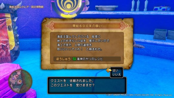海底王国ムウレアのクエスト「開館600年の願い」をクリアしました。クエストの受注は海底王国ムウレアの武器屋南東にある国立博物館、受注できるのはジャコラ討伐後、マーメイドハーブとレッドオーブ入手後。海底宮殿で魚になる必要がある。